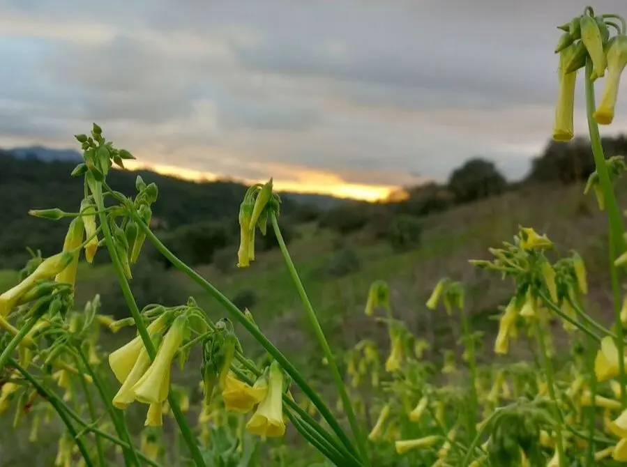 Nuppu katselee puutarhan yli kukkuloille SerVivo -kurssikeskuksen pihalla.