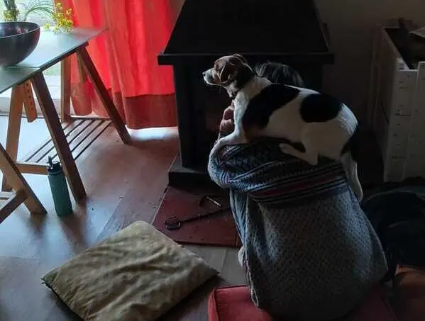 Toisiamme tukien, tulen ääressä kontsukoiran kanssa.