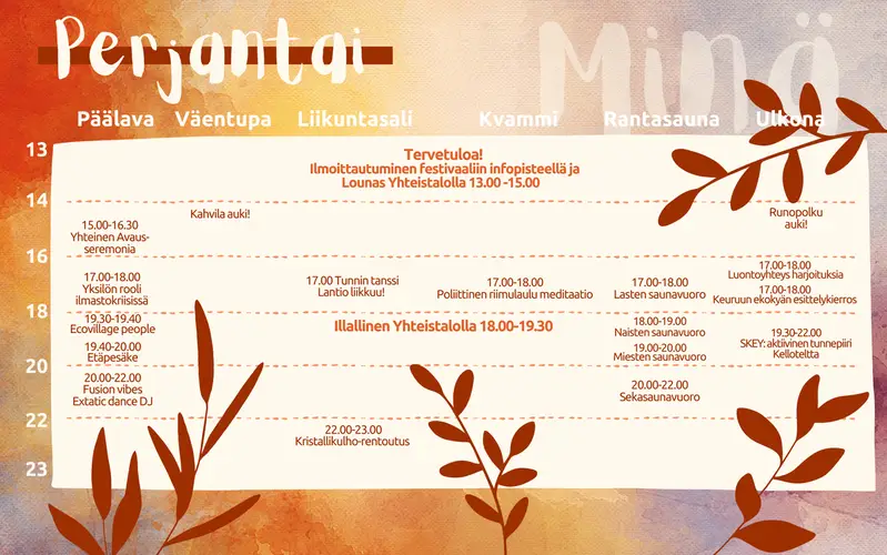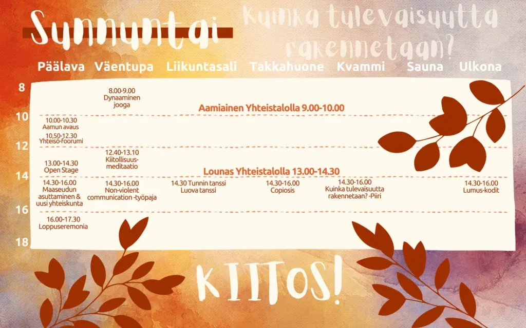 Molemmissa tapahtumissa yhteisöt, järjestöt, yksittäiset toimijat ja vierailijat ovat tuoneet mukanaan oman osaamisensa, näkemyksensä ja energiansa. Festivaalissa erityistä on se, että kaikki festivaalin aikana tapahtuva ylläpito on yhdessä osallistujien kanssa hoidettua. Kaikki osallistujat ovat tuoneet pienen panoksena festivaalin eteen. Festivaalin ohjelma on rakentunut osallistujien keskinäisestä jakamisesta. Ohjelmassa on ollut esimerkiksi työpajoja, keskustelupiirejä, musiikkia, liikettä, saunaa, ruokapiirejä ja luontohetkiä – kaikkea, mikä tukee kestävää, merkityksellistä ja yhdessä elettyä elämää.